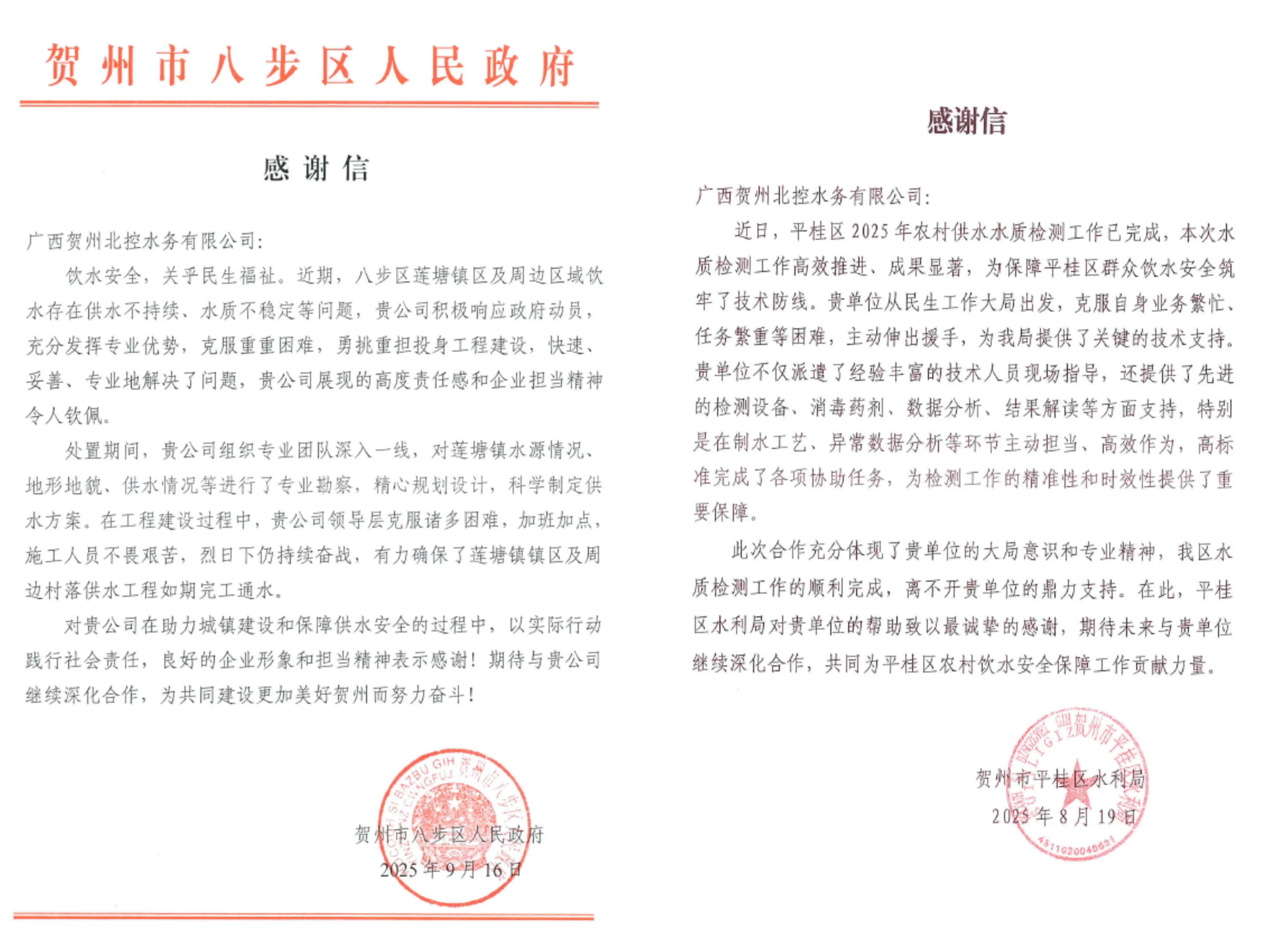 賀州水務公司助力八步區、平桂區開展村鎮供水保障提升工作獲贈錦旗和感謝信 2025-09-18