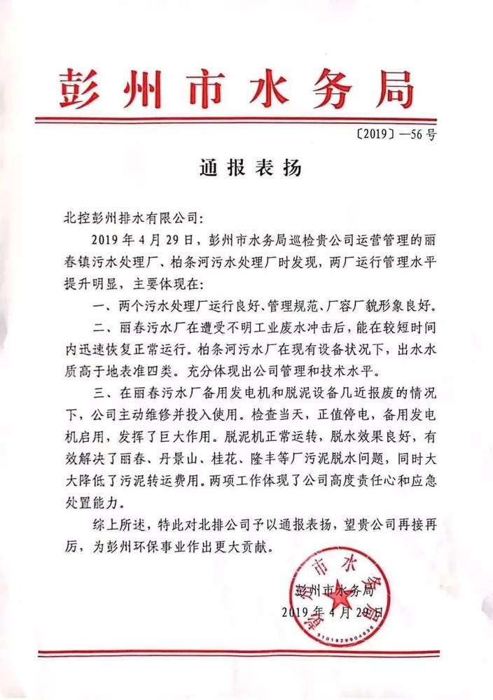 五一節(jié)前,北控水務(wù)收到四川省彭州市水務(wù)局的通報(bào)表?yè)P(yáng)信。據(jù)了解,麗春污水處理廠附近一管網(wǎng)破裂,北控水務(wù)旗下彭州公司主動(dòng)協(xié)助政府搶修,在較短時(shí)間內(nèi)恢復(fù)了污水廠正常運(yùn)行。