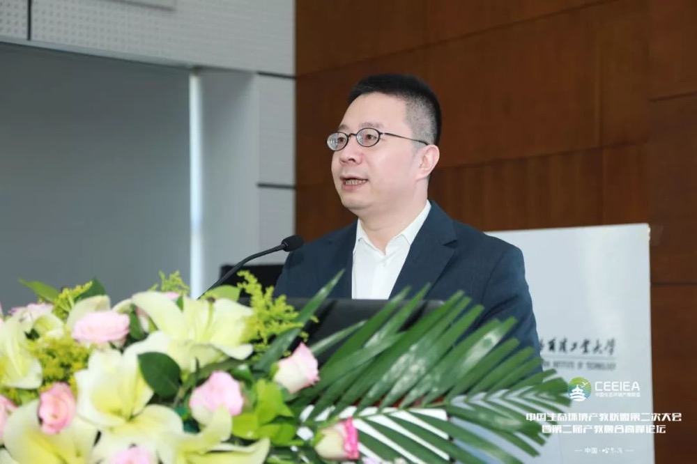 第二屆產教融合高峰論壇,由聯盟副理事長、哈爾濱工業大學環境學院副院長南軍教授主持。中國環境保護產業協會副會長兼秘書長易斌發表特邀報告《環保產業發展趨勢與人才需求展望》。結合當前環保行業發展情況,易斌指出,協同創新是環境技術的發展趨勢,環保人才培養也應注重產研學用協同創新機制,聚焦創新做強環保產業。