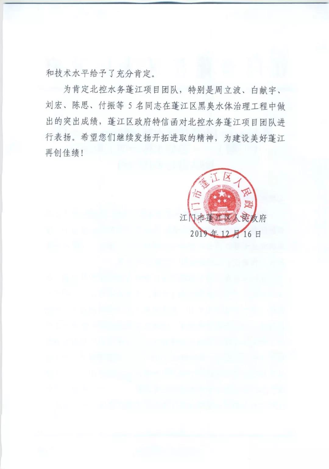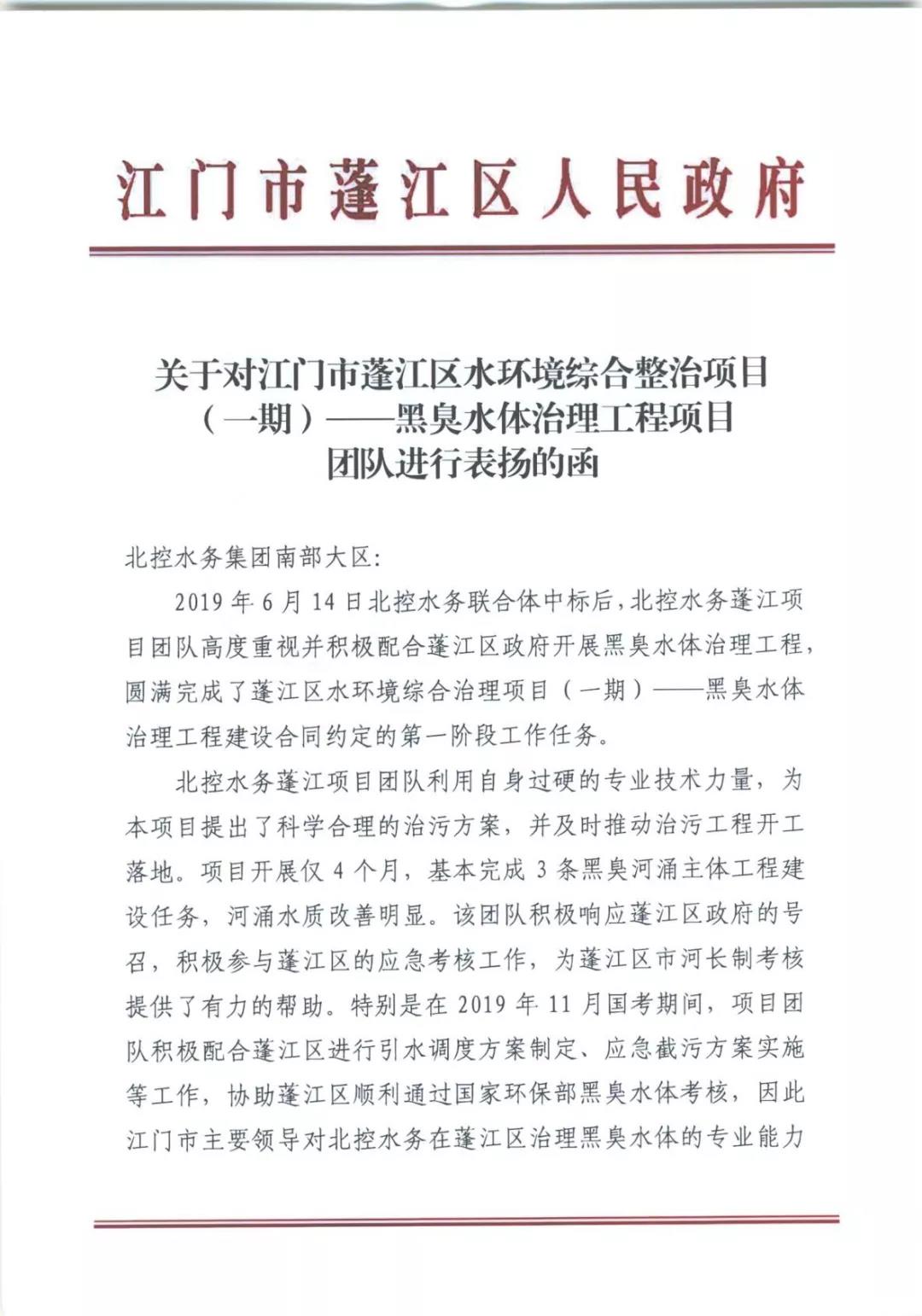 廣東省江門市蓬江區(qū)人民政府寫表揚信充分肯定和高度表揚北控水務(wù)蓬江項目團隊在蓬江區(qū)黑臭水體治理工作中做出的卓越貢獻 2019-12-25