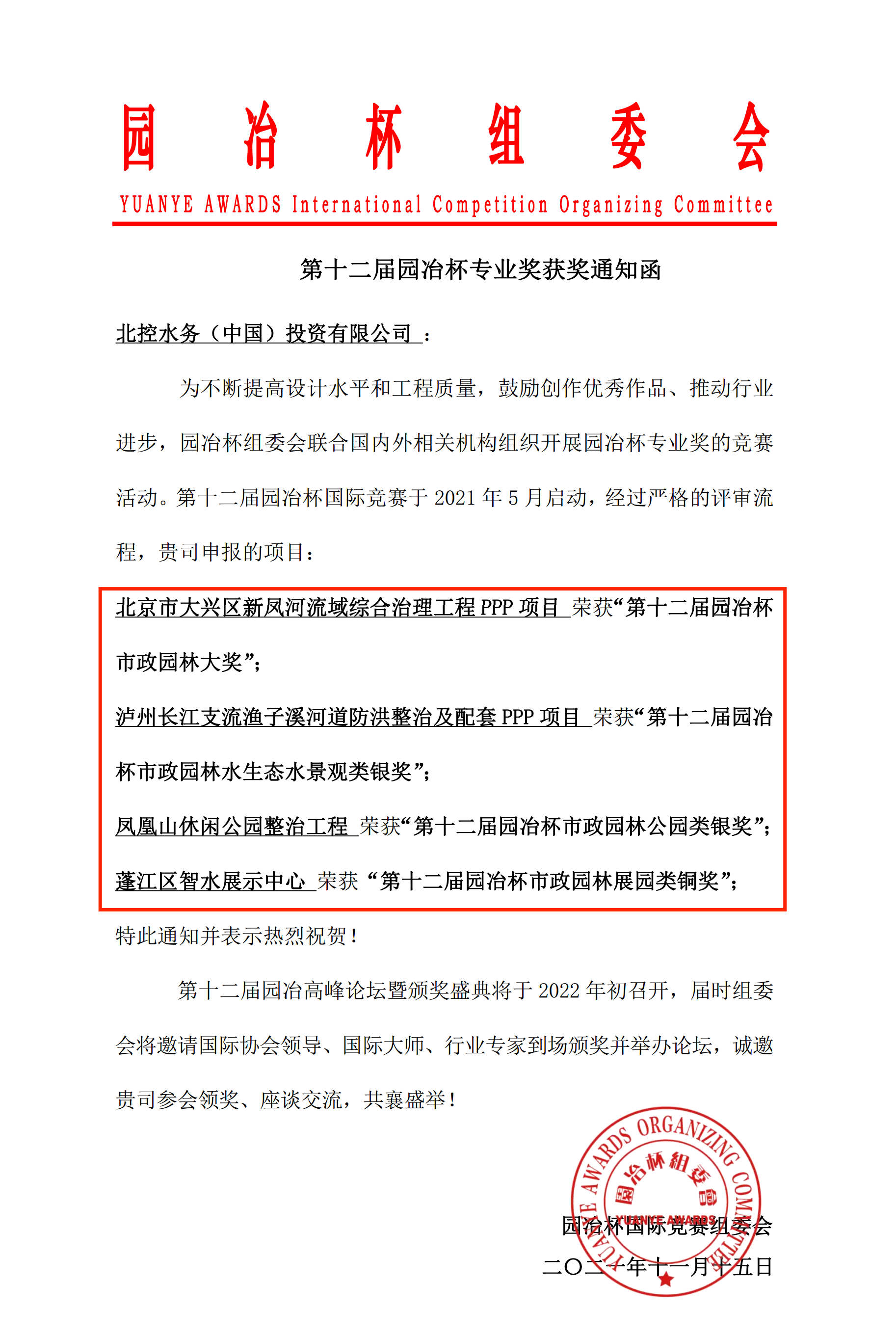 11月15日,第十二屆園冶杯國(guó)際競(jìng)賽總決賽落下帷幕,競(jìng)賽評(píng)出5個(gè)市政大獎(jiǎng)、1個(gè)鄉(xiāng)村振興特別獎(jiǎng)大獎(jiǎng)作品。北控水務(wù)抽取東西南北四大區(qū)典型項(xiàng)目參賽,經(jīng)過(guò)國(guó)內(nèi)外專家評(píng)審團(tuán)歷時(shí)數(shù)個(gè)月嚴(yán)苛評(píng)選,最終在300多家企業(yè)、1300多個(gè)參賽項(xiàng)目中脫穎而出,一舉斬獲1項(xiàng)大獎(jiǎng)、2項(xiàng)銀獎(jiǎng)、1項(xiàng)銅獎(jiǎng),充分彰顯了北控水務(wù)的技術(shù)實(shí)力和設(shè)計(jì)水平。