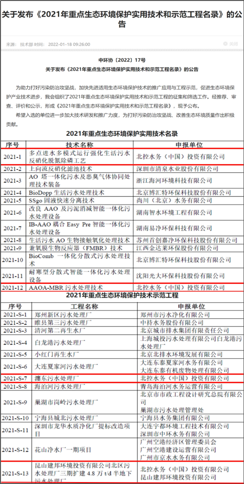 北控水務四項目入選《2021年重點生態(tài)環(huán)境保護實用技術(shù)和示范工程名錄》 2022-01-20