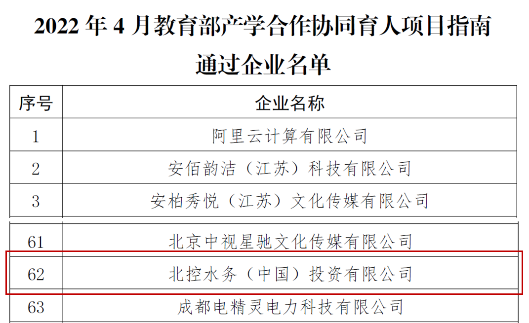 近日,教育部產學合作協同育人項目專家組發布《2022年4月教育部產學合作協同育人項目指南通過企業名單》,北控水務憑借領先的技術水平和研發實力、業務規模和行業影響力,以及多年來在產教融合領域的積累沉淀,成功獲批入選。