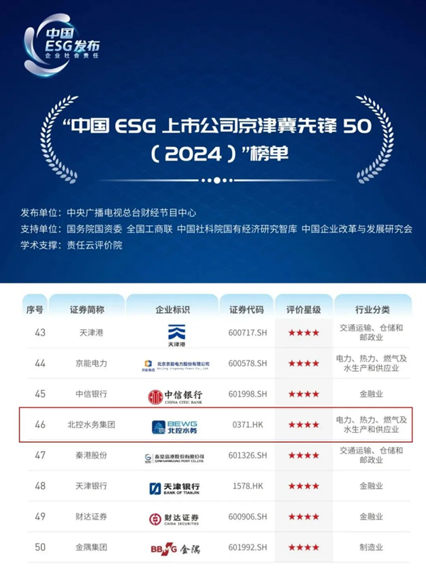 本次會議是京津冀首次聯合舉辦國有企業社會責任發布會,集中發布了京津冀三地社會責任/ESG藍皮書、國有企業社會責任/ESG報告。北控水務獲評“北京市屬國有控股上市公司ESG十佳案例”,入選“中國ESG上市公司京津冀先鋒50(2024)”,展現了集團積極響應ESG政策指引、高標準踐行ESG的顯著成效。