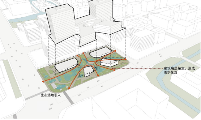 杭州市余杭區(qū)未來(lái)科技城196號(hào)地塊“海綿城市”項(xiàng)目,為保護(hù)城市水資源,北控水務(wù)采用雨水花園的設(shè)計(jì)理念,將建筑底層架空,引入生態(tài)濕地,并結(jié)合水處理行業(yè)特色,打造“海綿城市”樣板試驗(yàn)區(qū),形成生態(tài)、綠色的建筑環(huán)境,實(shí)現(xiàn)本地塊雨水收集調(diào)蓄比例不低于50%的目標(biāo)。